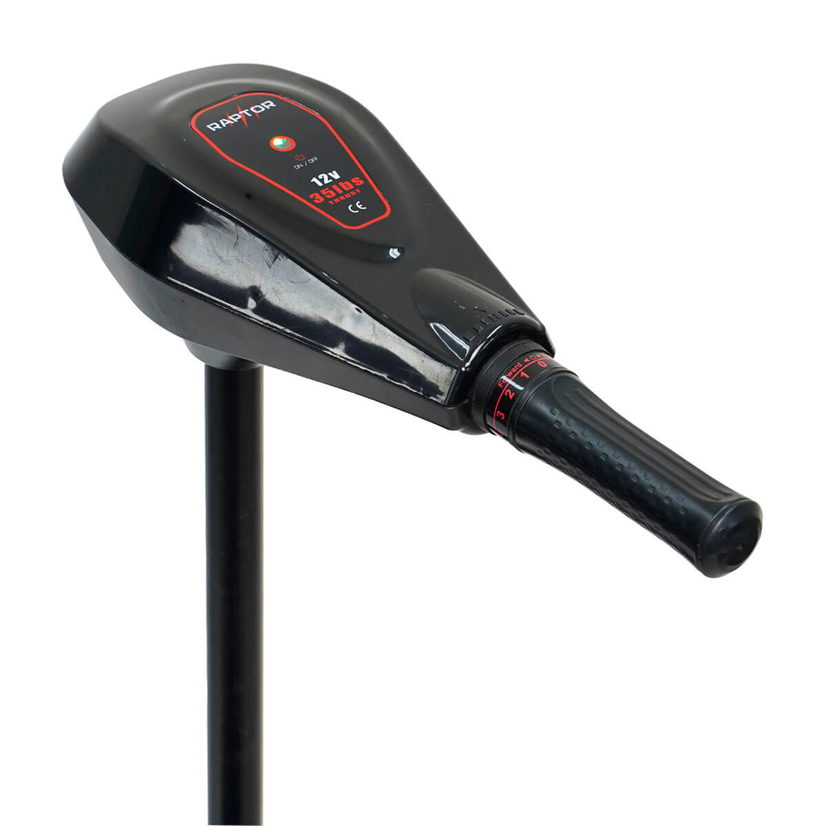 O veio do motor Raptor de 12 V e 16 kg (35 lb) tem 60 cm de comprimento e pode ser ajustado em altura utilizando o suporte de motor incluído. Isto garante que coloca sempre o motor na profundidade correta na água e evita que a hélice de 2 pás bata no fundo em águas pouco profundas. O motor é controlado pela alavanca de controlo, que tem 5 velocidades para a frente e 3 para trás.
